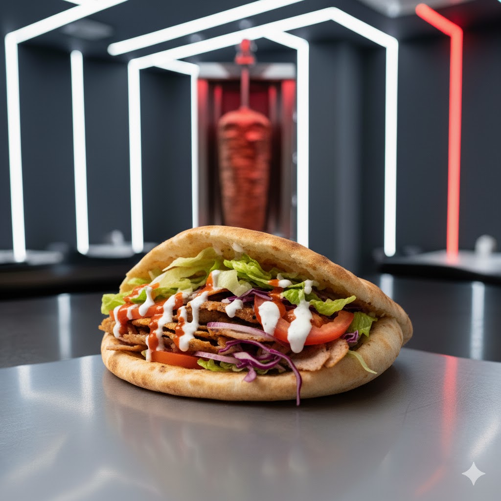 Le Kebab Complet : notre délicieuse viande grillée dans son pain, accompagnée de frites croustillantes et de la boisson de votre choix. Un classique qui ne déçoit jamais !